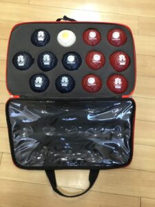 えいっ!! 紅組の1球目を投じます。白色のジャックボールに近づけます。