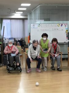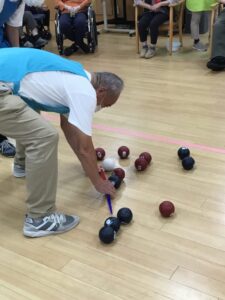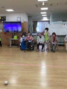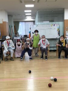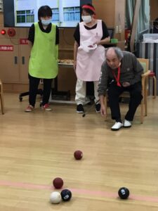 デイサービスでは10月の行事として、パラリンピックの競技として行われたボッチャを本物のボールを使用し行いました。2チーム対抗で行い、白熱した試合が行われました。その時のご様子を紹介させていただきます。