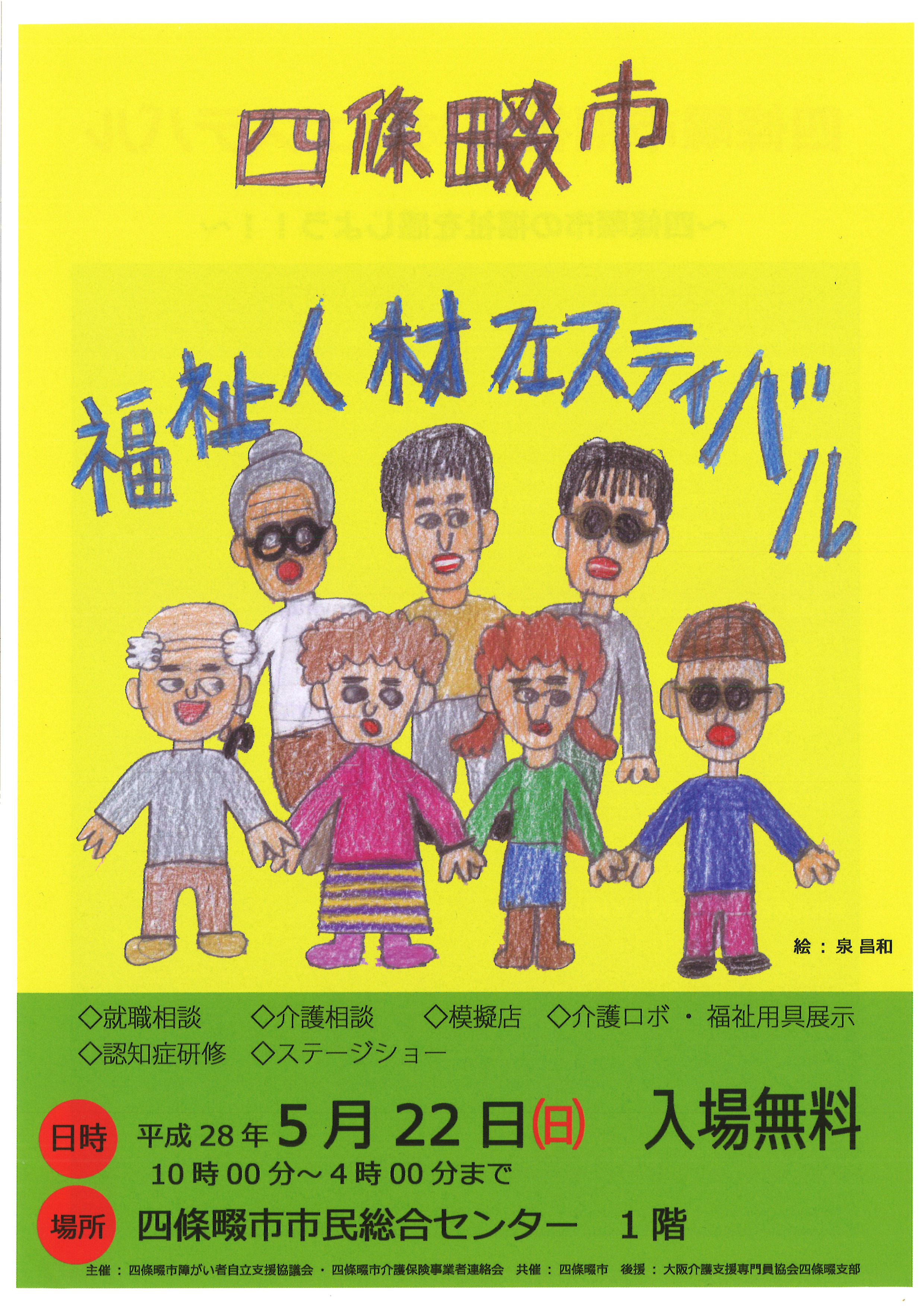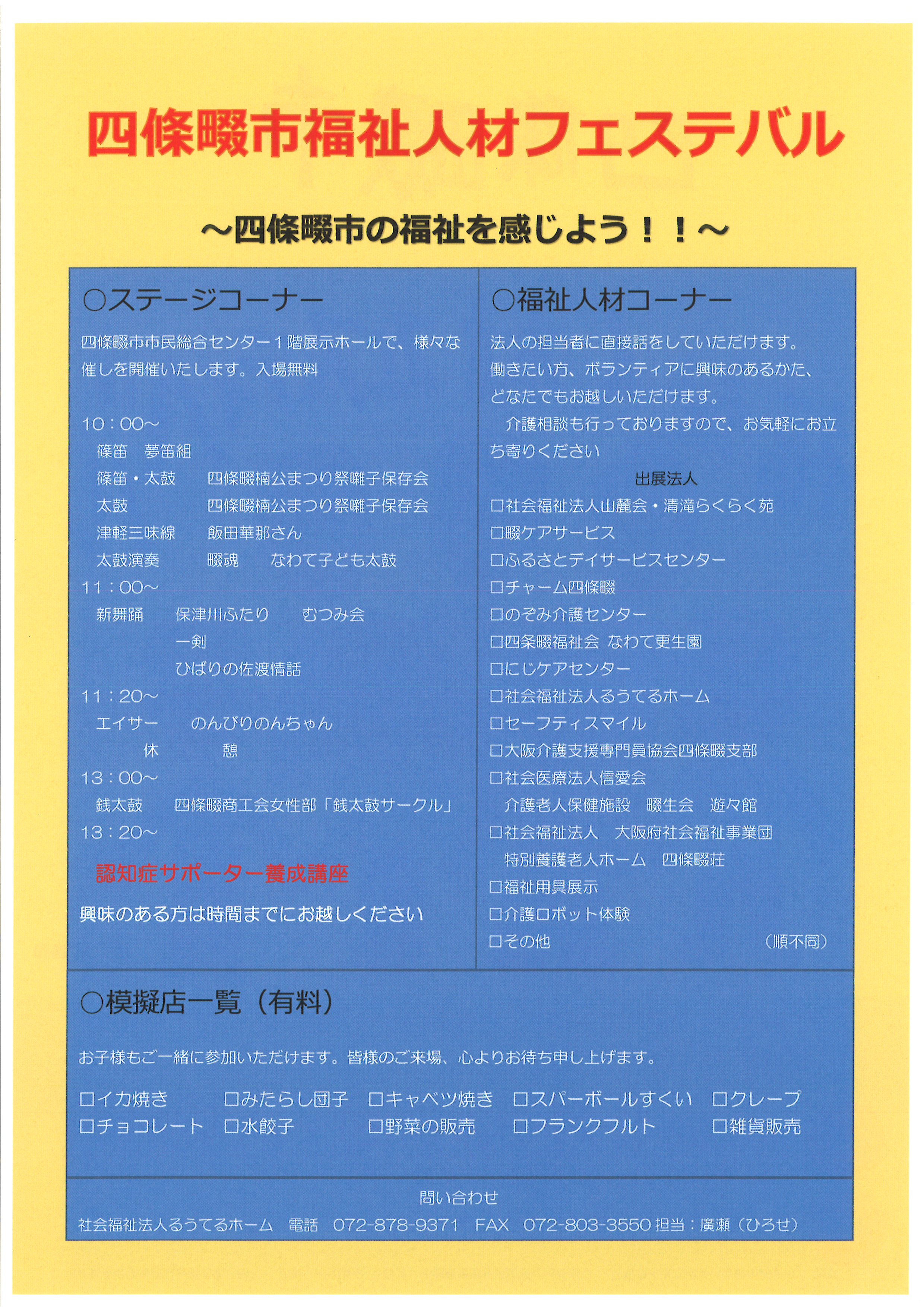 2015年5月22日(日)に、四條畷市民総合センターで行われる『四條畷福祉人材フェスティバル』に、るうてるホームも出展します!